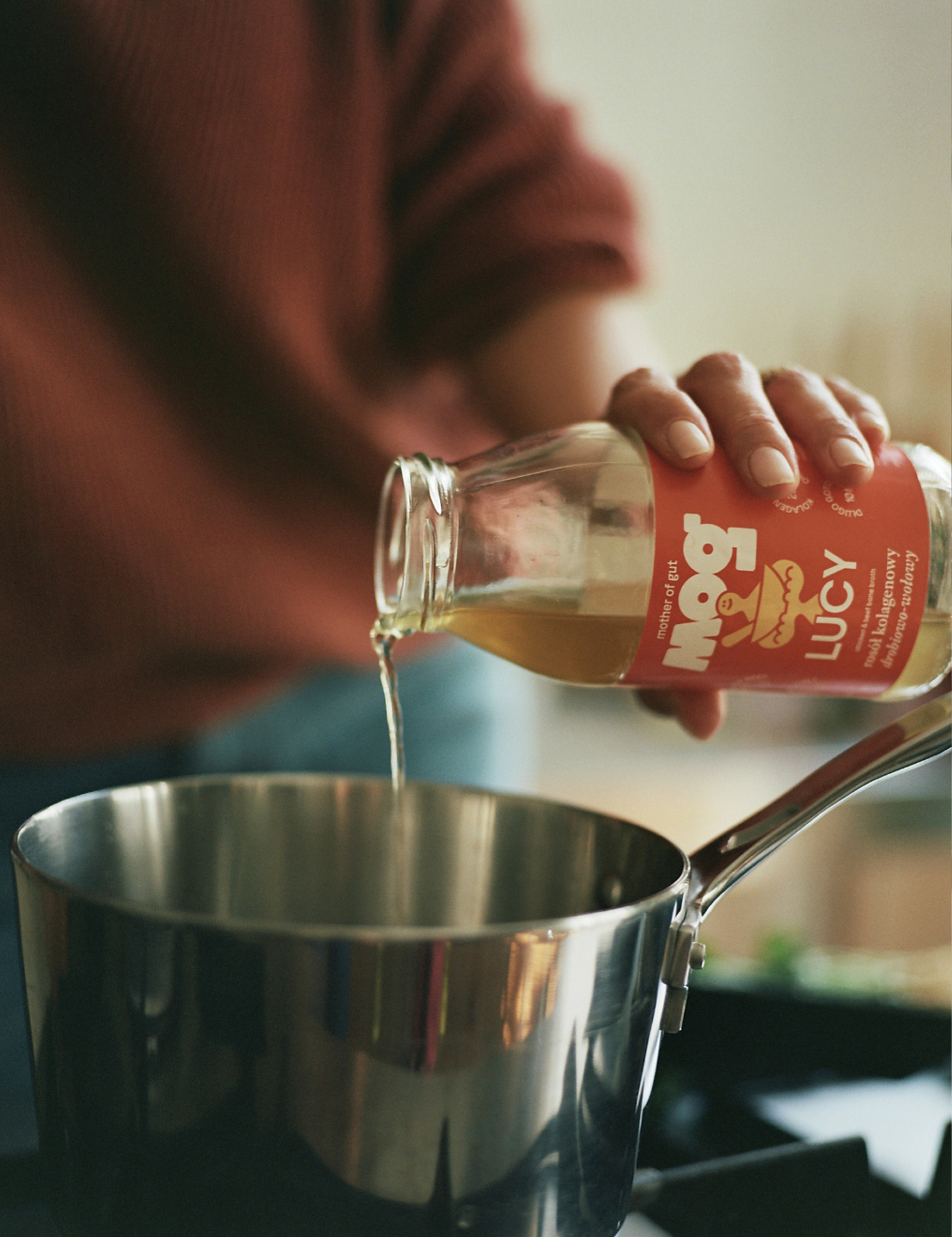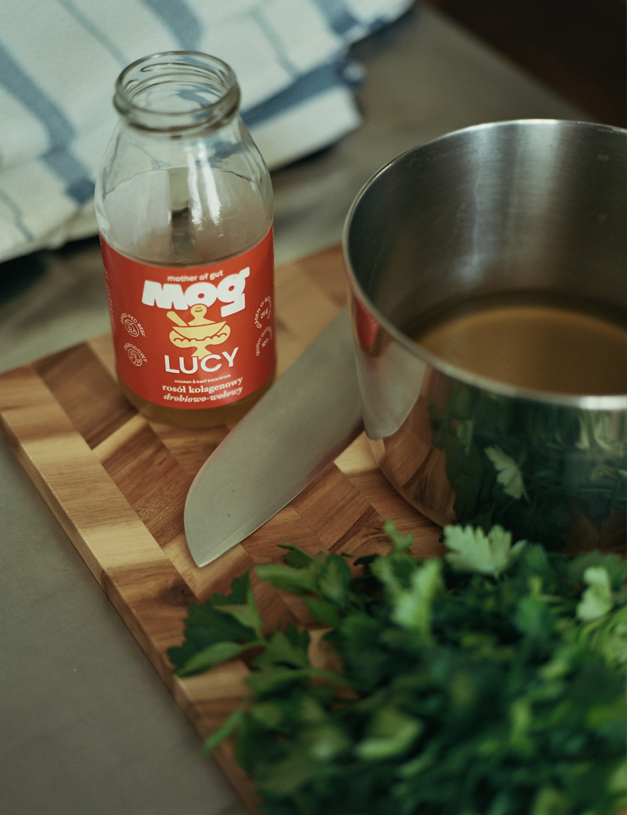 Rosół LUCY x MOG, to gotowany przez 10 godzin bulion z pełnym profilem aminokwasów, które wspierają regenerację mięśni, wzmacniają układ odpornościowy, poprawiają funkcje mózgu, regulują poziom cukru we krwi, a także pomagają w produkcji hormonów i enzymów.